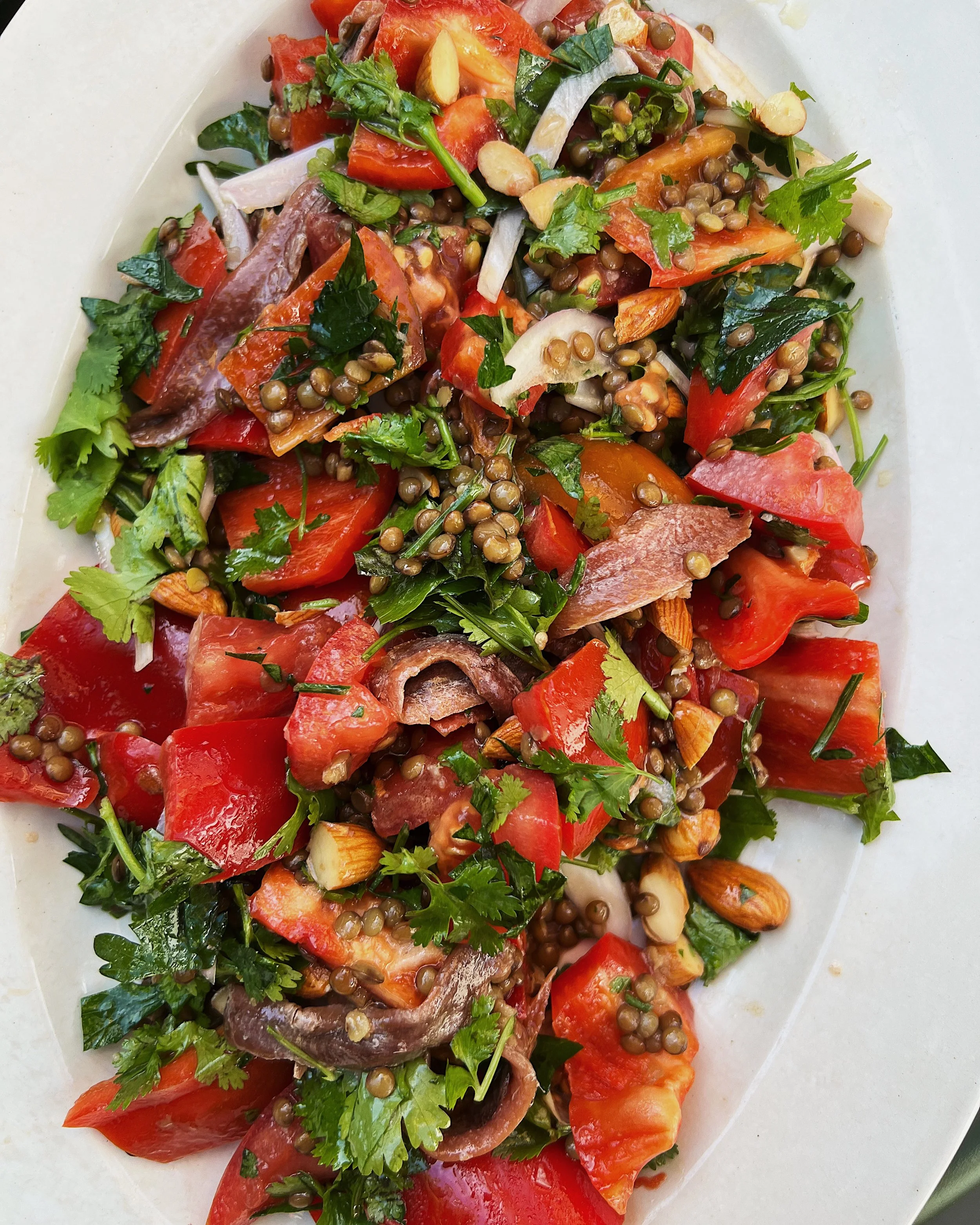A simple salad full of freshness and crunch. Substantial enough for a proper lunch - add some hard boiled eggs or some homemade croutons or both for an even heartier dish. Leave the anchovy out to make it vegetarian if need be.